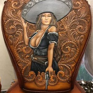 This seat features a front panel adorned with a fearless bandida, dressed in western noir with a seductive and commanding pose—pistol drawn, sombrero tipped. Her gaze says it all—power, passion, and pride.