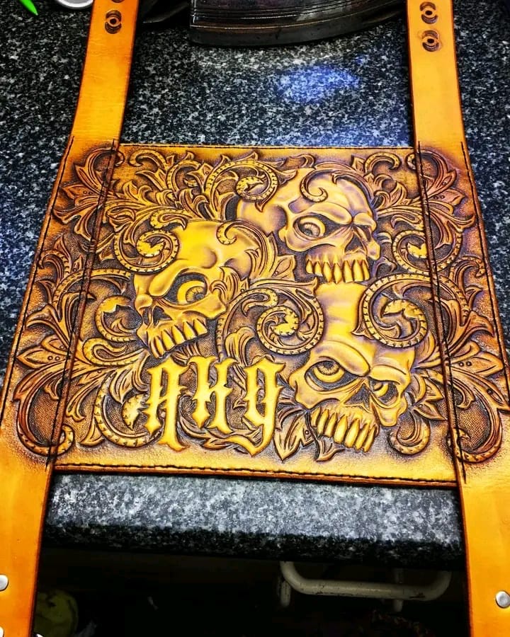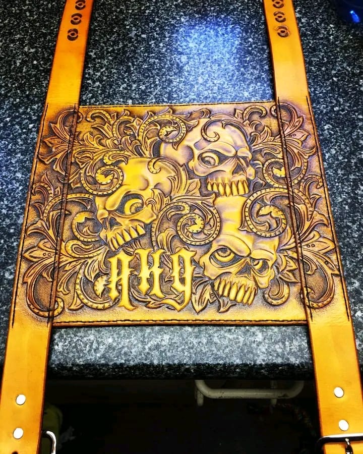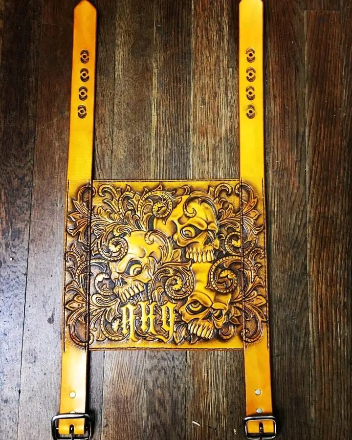 Made from premium, full-grain leather, the strap features deeply embossed skull artwork surrounded by ornate scroll patterns, accented with gothic-style lettering. The rich, hand-dyed finish in golden-brown tones gives it a rugged yet refined look that stands out on any bike.