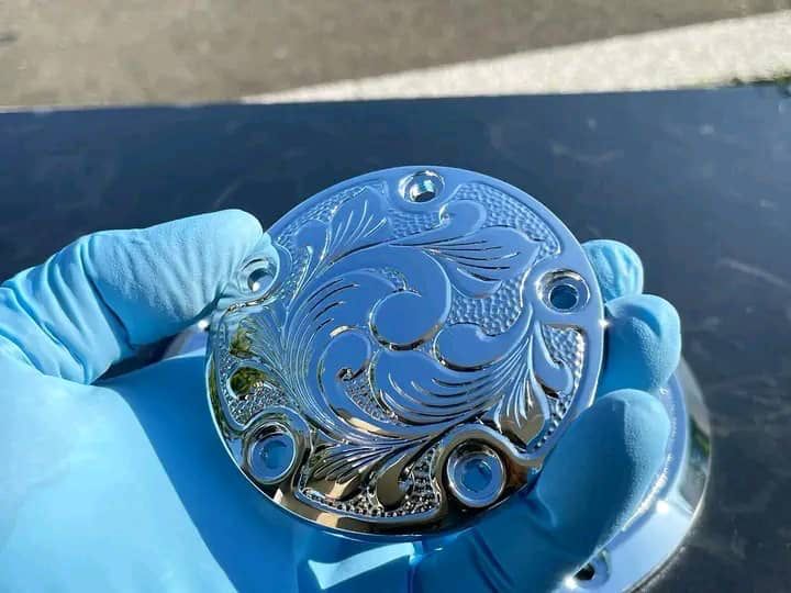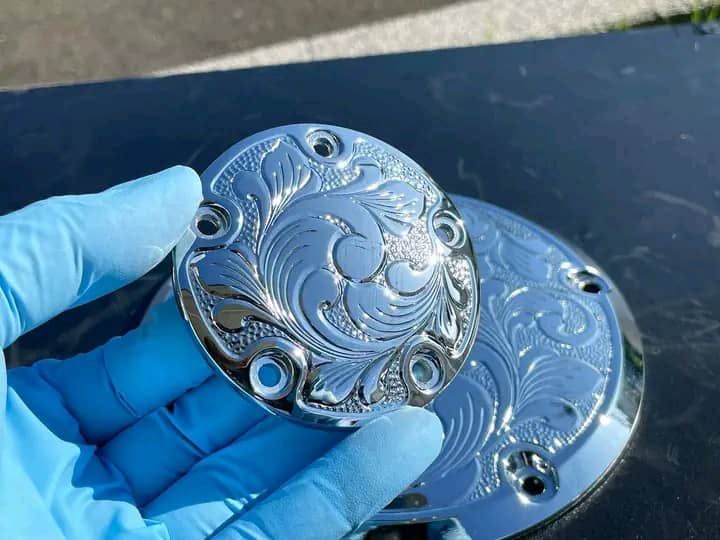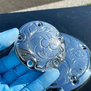 Hand-engraved with an intricate floral scroll pattern, this cover showcases artistic detailing that stands out. Each swirl and leaf is etched with precision, giving your bike a touch of timeless craftsmanship.