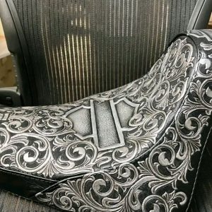 Custom Tooled Solo Seat – Black & Silver Scroll by Engrave Cartel
