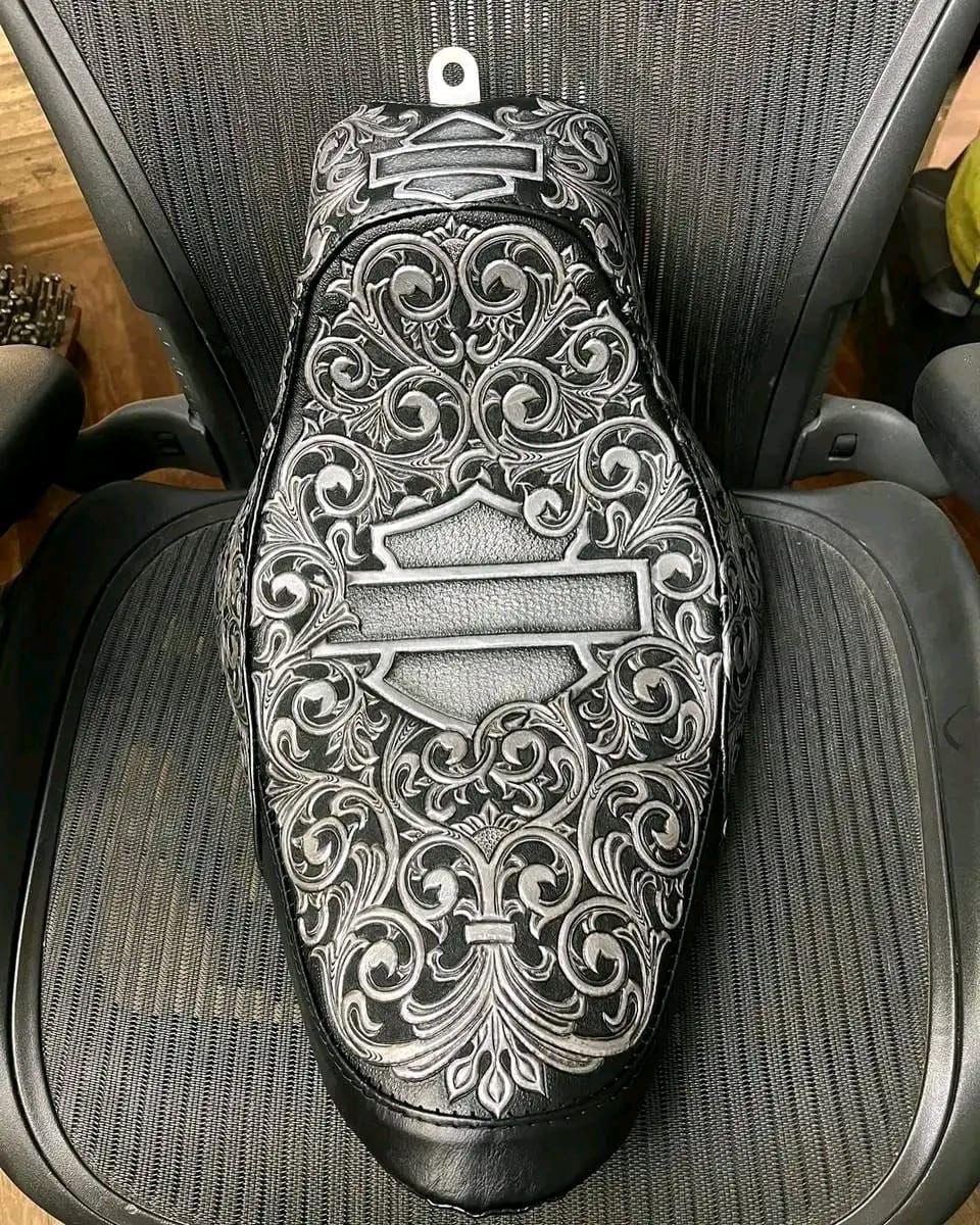 Every inch of this seat is a canvas of art. Expertly hand-tooled on premium black leather, the surface boasts a stunning scroll and floral engraving in bold silver highlights. The intricate patterns reflect a fusion of heritage and attitude, giving your bike a vintage-meets-modern edge.