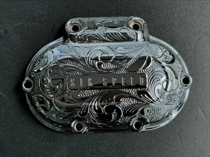 Crafted from high-grade aluminum and finished in a stunning black chrome polish, this transmission side cover features deeply detailed Western scroll engravings that radiate elegance and power. The “SIX SPEED” inscription at the center boldly marks your machine’s might while blending seamlessly into the intricate design.